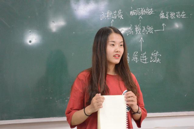 孔鸽曾在大一下学期期末考试取得高数满分的优异成绩。在进行讲课之前孔鸽认真并系统地整理了高数下册课本中的重点和难点,并提前收集学院学生不会做的题。经过简单的介绍后孔鸽自信地走上讲台,随后她条理清楚地将自己准备的内容逐一讲解,并将解题的过程以工整的板书展现给学生,让同学们对题目的解题方法和解题思路有一个更直观的理解。