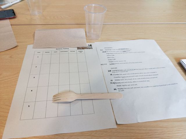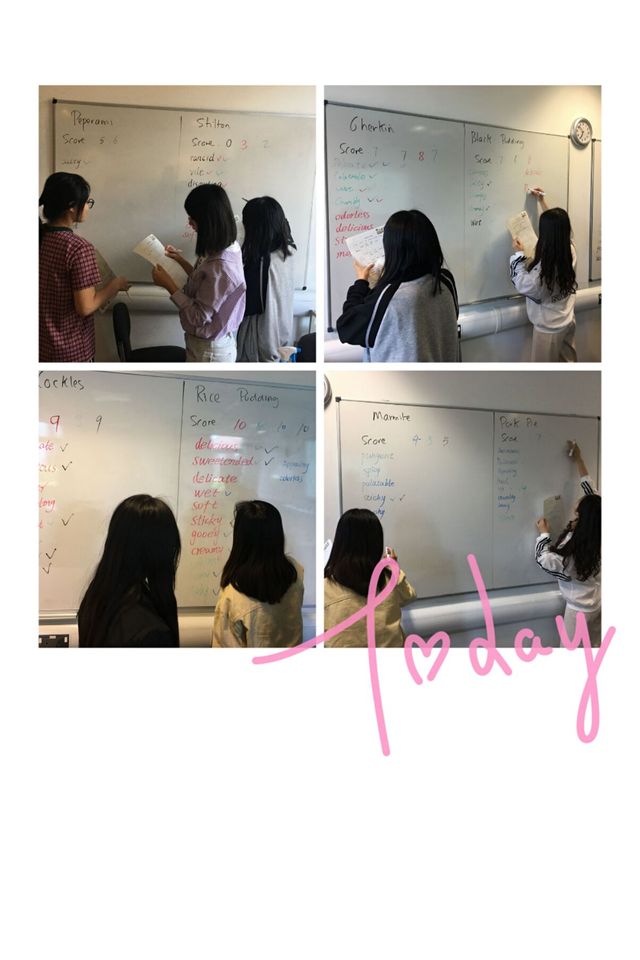品尝完所有的食物后,每个小组对食物打分并将描述的词汇写在白板上。