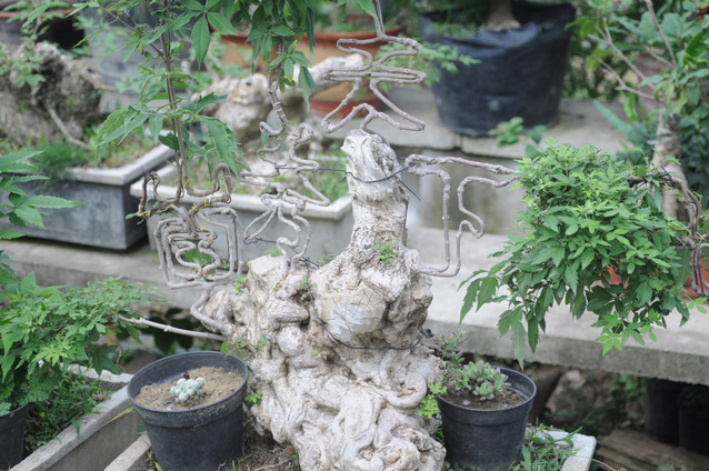 随后陈叔叔与实践团成员聊起他的创业史,他的工作经历很丰富,当过消防兵,下过矿山,养过桃,最后父亲的一个花卉设计启发了他,使他开始研究如何使树木自己长出字,开启了他的创业之旅。经过九年的艰苦创业,总结了五个字“新、奇、特、优、空”,并取得了成功。他认为现在国家政策好,人的生活提高,从而精神上的追求紧随其后,所以盆栽就会有销路。但他的创业之旅并不是一帆风顺的,他先是用木板压枝,茎秆易被折断;后用水泥做模具,花枝被烤死了;最后铁丝固定,经过培养终于成功;到现在经过进一步改进,用可自动脱落的卡扣。