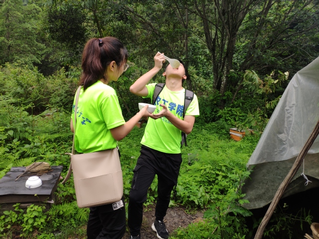 “绿色脊梁”实践团团队成员首先在于正文厂长的带领下,乘面包车经过崎岖的山路后到达螺髻山区,同学们最终见到守林人廖荣品,通过与守林人廖荣品的交谈同学们了解到,廖荣品已经在山上居住了十多天,但是他还需要再在岗位上坚守,这十几天他吃从山下带来的粮食喝山上的泉水。条件十分艰苦,然而这就是每一个基层守林人最普遍的生活情况。