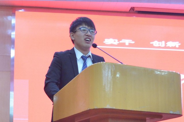 会议进行第三项有在校生代表,农机1605班李冲同学发言。李冲同学自己大学经历,从“学会做人”、“学会做事”、“学会做学问”三方面对学弟学妹们提出中肯的建议,并祝福大家勇往直前去追求平凡中的卓越,祝福大家用自身的魅力去实践青春无悔的诺言, 在最广袤的天空下像雄鹰一样展翅翱翔!