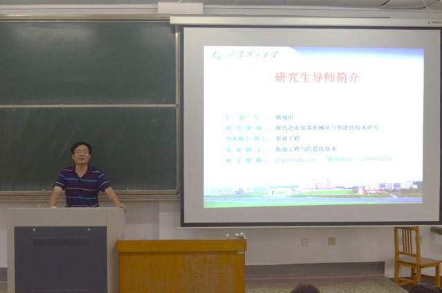 随后,我院的各系研究生导师都依次对各系研究生培养,自己的研究课题和方向进行了介绍,其中农业工程系教师刁培松提到自己研究的课题:整地技术激光平地系统、玉米播种机发展方向、免耕播种机、新型机械化收货技术等。耿端阳简单介绍团队的科技成果获奖、人才资助情况以及授权专利情况等。能源系教师付鹏强调在研究生学习中兴趣的重要性,其它系教师也分别介绍了团队情况与研究课题等。