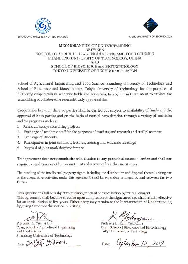 2019年9月20日,我院与东京工科大学生物科学与生物技术学院签订框架合作协议。