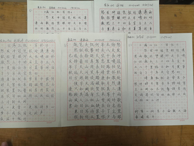 比赛伊始,学习部负责人讲解此次比赛的规则,以《满江红•写怀》这首诗词为基础,简述宋朝年间,爱国诗人岳飞出战征讨敌人所做的诗,全诗中,表达作者壮志难酬、为国杀敌的爱国情怀。负责人要求同学们在分发的田字格内,填好自己所在的学院、班级和姓名后,用中性笔照着《满江红•写怀》临摹诗词,最后,负责人将统一收齐,并对作品进行打分,学院前五名将可继续代表学院进行全校的比赛。