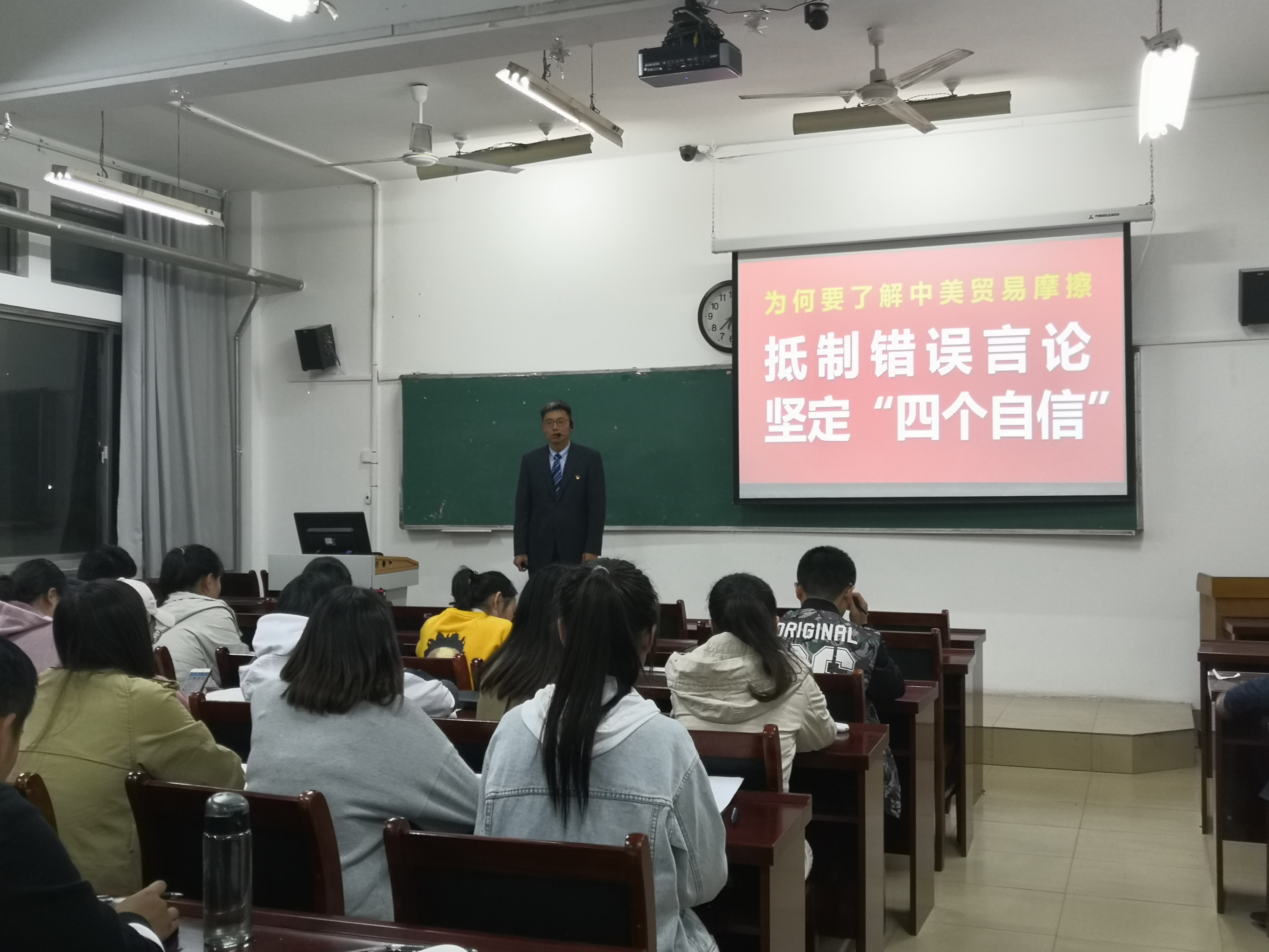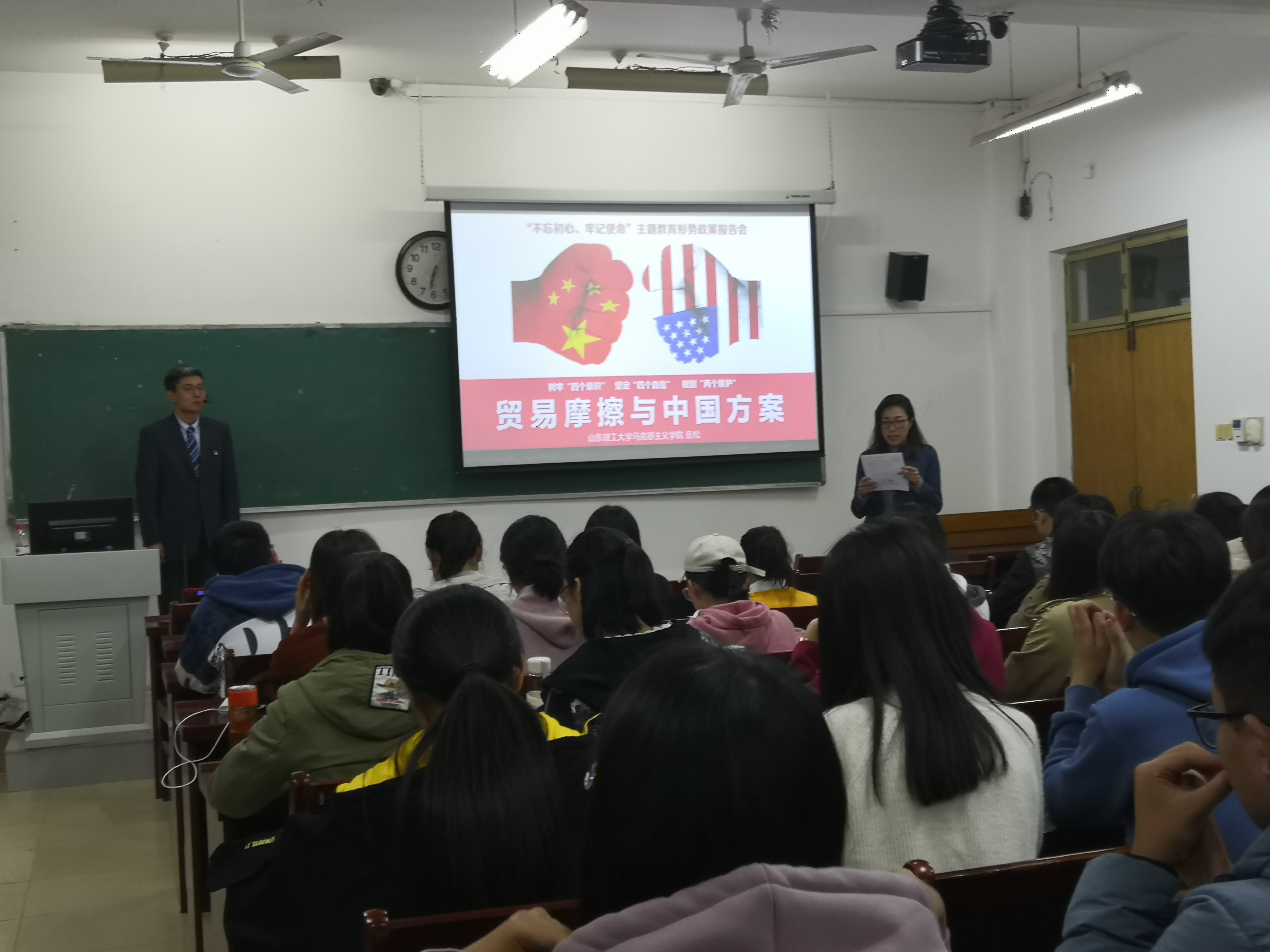 为推进我院“不忘初心、牢记使命”主题教育形势政策教育深入开展,10月31日晚,我院于12#101室举办“思政大讲堂”,邀请我校优秀教师岳松作《树牢“四个意识” 坚定“四个自信” 做到“两个维护”——贸易摩擦与中国方案》报告。报告会由党总支副书记戴洁主持,全体学生党员参加。