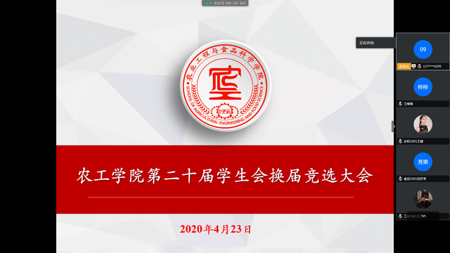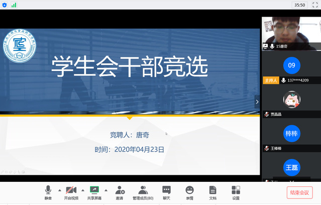 为加强我院学生会建设,充分发挥学生会作用,更好地开展学生工作和培养优秀学生干部。4月23日下午,我院举行2020届学生会换届大会,此次换届大会采取“云换届”的方式。学生会指导老师苏新勇主持会议,我院党总支副书记戴洁、全体辅导员、2019届学生会骨干及部分普通学生代表参加会议。