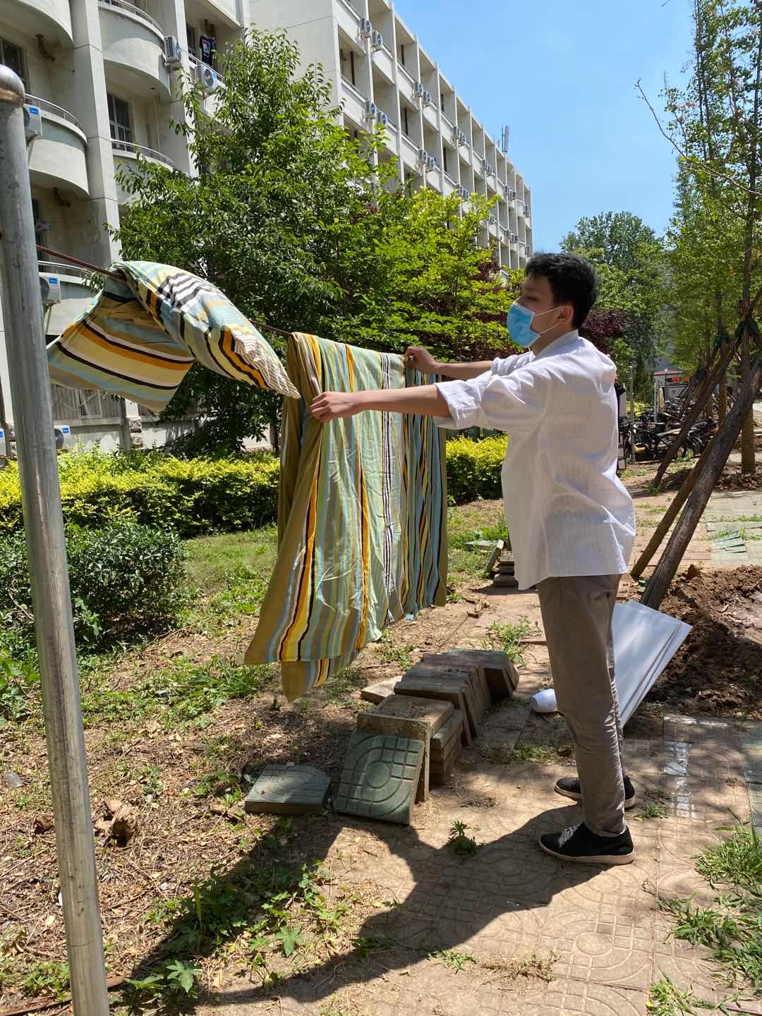 为了做好学生返校后的疫情防控工作,学院还为学生提供爱心大礼包,配备口罩、消毒液、测温枪。除此之外,为了让学生回校之后能够尽快适应宿舍生活,辅导员老师为学生们打扫卫生、开窗通气、晾晒被褥。