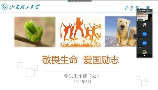 在第二部分中,辅导员老师为同学们就“大国风范,青春力量”主题进行演讲。他们表示,中国由世界的“重灾区”到如今的“世界上最安全的地方”的转变,离不开党的正确领导,更离不开人民的力量。当代青年更是勇于担当,站在抗疫第一线,为全国人建立起战疫防线,并列举了学校、学院师生积极捐款捐物、参与抗疫一线志愿服务的实例,诠释了山理学子的青年担当。
