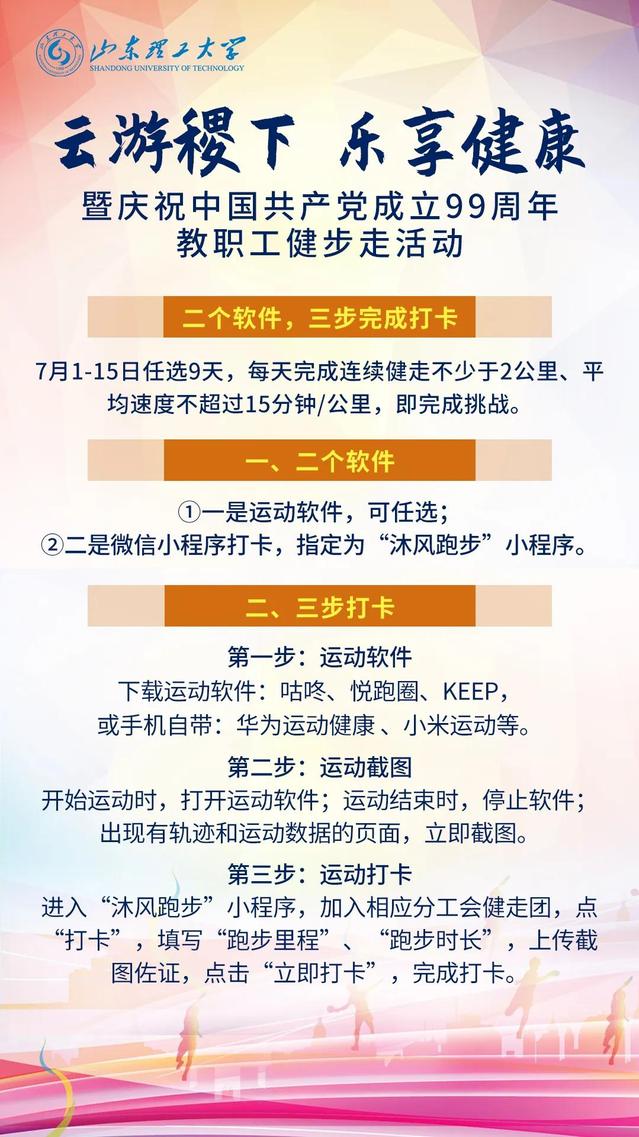 为庆祝中国共产党成立99周年,引导教职工疫情防控常态下科学健身、共同抗击疫情,学校研究决定通过“线上+线下”联动,开展教职工健步走活动,为教职工搭建“全民健身云舞台”。7月1日上午,“云游稷下 乐享健康”暨庆祝中国共产党成立99周年教职工健步走活动云开幕,正式启动健步走活动。