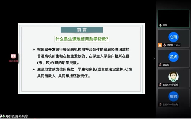 6月29日下午,我院使用腾讯会议,举办了助学贷款线上培训会。此次会议由郑群老师主持,已申请助学贷款及有意向申请助学贷款的同学参加。