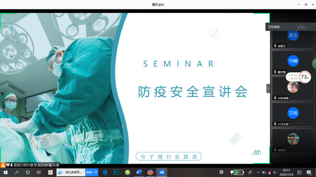 7月24日,举办防疫宣讲会,并对整个社会实践活动进行总结。队长康忠雪在会议开始前与队员们合作制作宣传海报发布在QQ空间,将此次宣传讲座对外宣传。张学龙负责此次宣传讲座,首先将“农工先锋,与子偕行”实践团实践成果进行展示,以帮助人民更加清晰地认识此次新型冠状病毒疫情,进而学习防疫知识,保护自身安全;之后为大家详细讲解了传染病的特点以及预防措施。