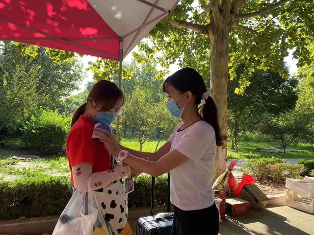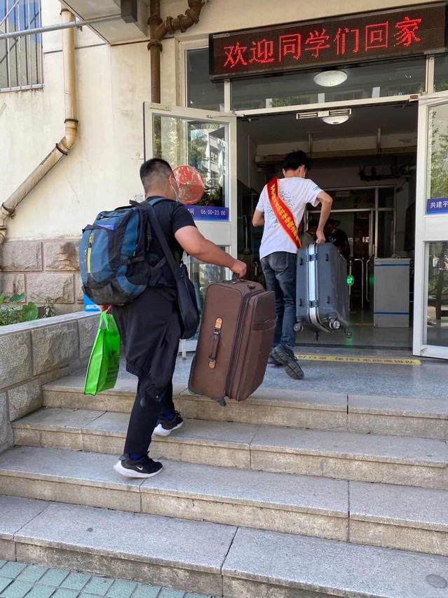令人感动的是,在返校现场的志愿者是一道亮丽的风景线,甚至很多志愿者都是刚刚返校的学生,放下行李立即加入到志愿者的行列中。他们身披红色绶带,在校门帮助返校生运输行李,介绍如何出示身份与健康证明,来回奔波于楼层宿舍之间,微笑伫立于骄阳之下。