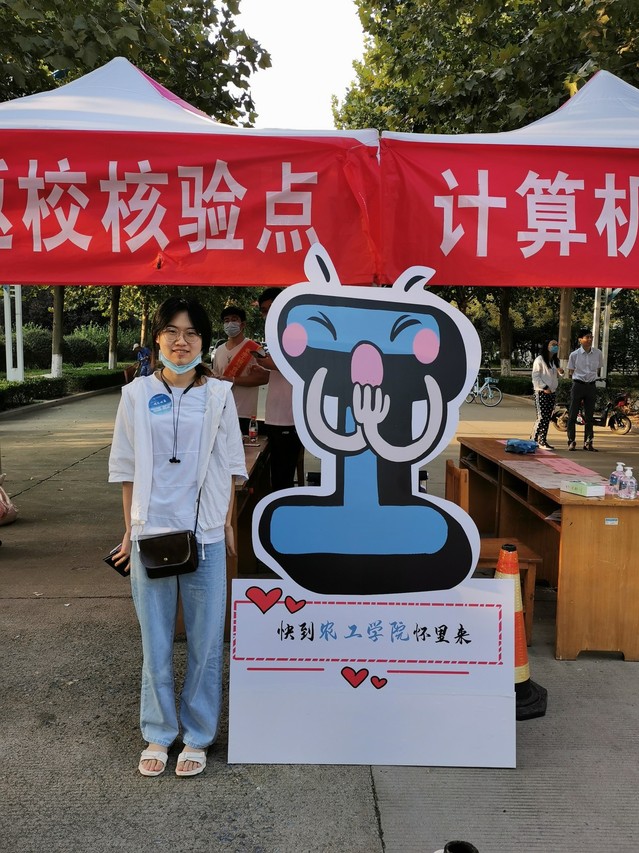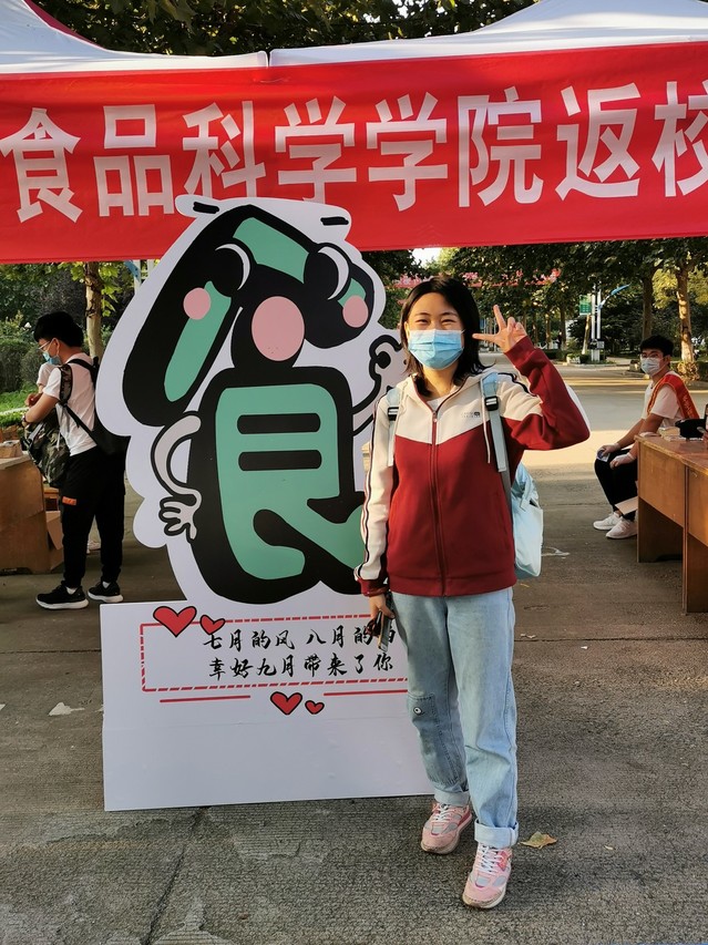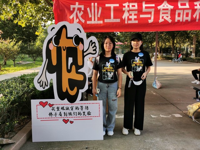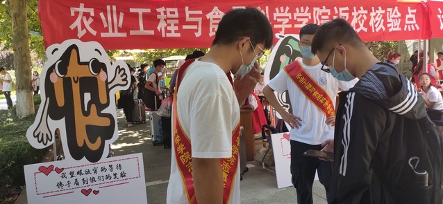 学院辅导员和志愿者提前抵达报到现场,精心准备“农”“食”“工”表情包迎接返校同学,返校学生纷纷和本专业表情包合影留念。