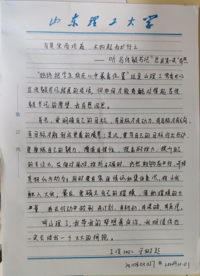 在国庆前夕,我们全体山理工2020级新生共同学习了吕书记主持的思政第一课,在这一刻吕书记围绕“楷模、目标、行动”向我们展开讲授,在这一课中,让我们对未来大学生活乃至人生有了更加深入的思考与感悟。