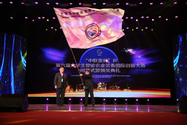 陈学庚院士宣布第七届大赛将由河北农业大学承办,并移交大赛旗帜。