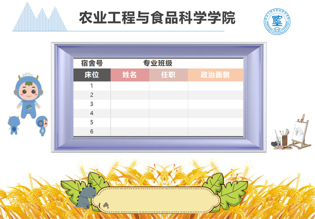 本次大赛共征集到作品58件,每一件作品各有特色,集中体现了同学们严谨认真的态度,表达了同学们热爱学院的情怀。经过初筛、复评、终评三个环节,确定了最终的录用稿件。该稿件设计简洁大方,以智慧农场的秋收景象为底色,前置涵盖宿舍号、专业班级、宿舍成员姓名、任职以及政治面貌的信息表格,既应宿舍实用之需,又突出了我院专业特色,获得了一致好评。目前,我院本科生宿舍门牌均已张贴完毕。