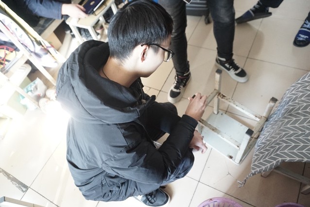 只见学生党员们带着凳腿保护垫深入学生宿舍,与宿舍同学沟通交流表明来意后,分工协作,收集凳子,清理凳腿,粘贴保护垫。从一楼到六楼,学生党员先锋们不错过任何一个宿舍,为15号公寓楼的每一间宿舍的凳子都贴上了保护垫,宿舍同学纷纷向他们表示感谢。志愿服务后,学生党员先锋带着余下的凳子贴和产生的垃圾离开了宿舍。