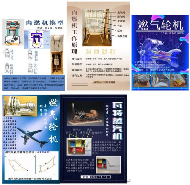 两人一组负责设计海报和制作热机模型,任课教师指定题目,每位同学都参与其中。模型装置的尺寸设计、结构布局、材料选择、关键部件以及海报内容、字体颜色等都需要学生设计制作。模型按照老师的要求不断改进提高。模型制作提高了学生动手能力,锻炼了他们思考问题-分析问题-解决问题的能力,提高了学生参加科技竞赛的自信心。
