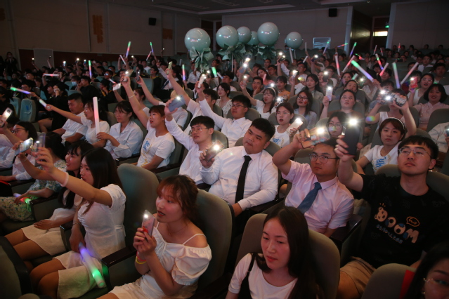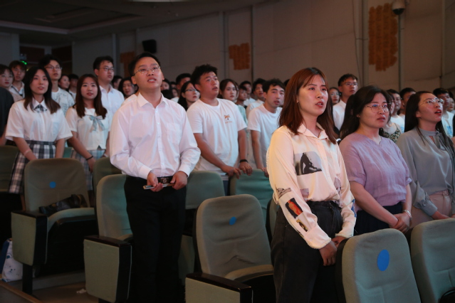 “日晖月朗森森乔木已参天 共切磋 同奋勉 将时代重任担向双肩”,校歌《你伴随我》大合唱推波助澜,勉励学生牢记“厚德、博学、笃行、至善”的校训,立大志、明大德、担大任,让青春在祖国和人民最需要的地方绽放光彩。