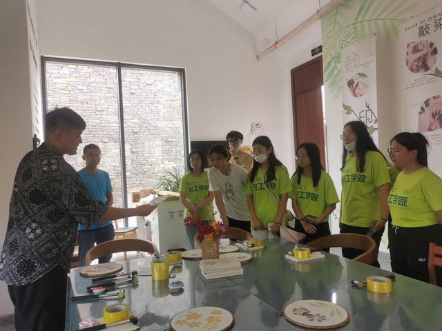 紧接着,团队前往喜柿文创商街,“将草木最美的一刻,定格于指尖舆布”,这是敲染馆的文化理念,接待员为实践团详细地讲解敲染中观、敲、印、染、烫的过程,展示敲染过后的衣服、帆布袋、手帕、扇子等作品,团队成员纷纷赞赏这来自大自然的艺术风采。