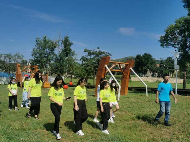 在接待员的带领下,团队领略到柿子红理想村里的“小确幸”。绿乐园开阔的视野和静谧的环境、山野风味、亲子旅游的娱乐项目都成为了宝妈宝爸们的亲子拓展乐园。绿乐园里融“绿色”、“共享”、“艺术”于一体,充分展现绿色美丽乡村的风貌,同时艺术设计等专业学生可以在这里进行研学考察。接待员提到这里的花海都会被充分利用,将花瓣进行敲染,可以将花海的印记长存,也符合绿色可持续发展的理念。