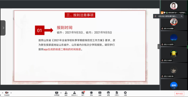 时逢新生开学季,为前置新生入学教育,提高新生安全意识,落实疫情防控要求,促进师生认识,我院于8月29日组织召开2021级新生安全教育及报到安排线上主题班会。班会由我院2021级新生辅导员马俊俊、李玮主持,12名2021级班级导生及全体2021级新生参加。