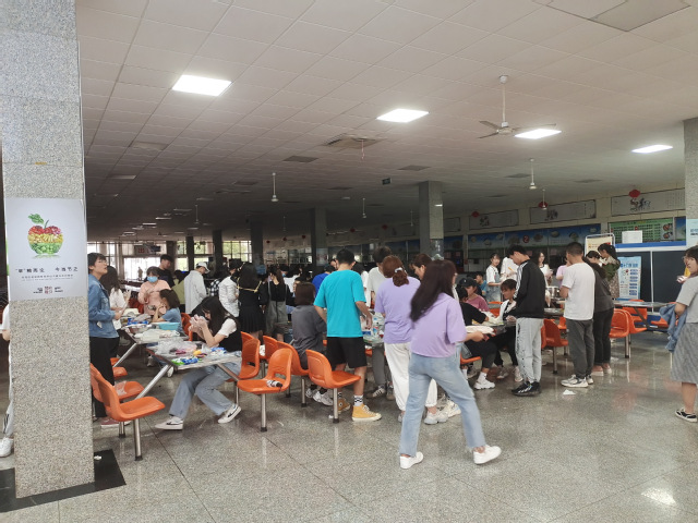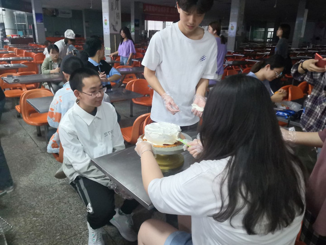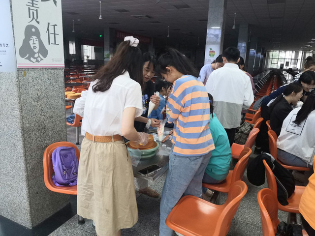 把建党一百周年的精神和内涵融入到蛋糕中,以这种独特的方式庆祝建党一百周年。 很快,第一组的同学就完成了他们的创作,他们将转盘和其他工具传递给下一个组,创作又开始了。一时间,三餐二楼充满着欢腾喜悦的气氛。