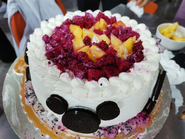 活动伊始,会长肖玉莹和其他工作人员布置现场,将各项工具材料摆放好,打造一个温馨适宜的环境。协会工作人员将每组选手制作的蛋糕进参赛人员分三部分在不同时间段进行创作。各色的水果摆放在盘子中散发出阵阵清冽的果香,打好的奶油着淡淡的黄色,紧接着,同学们进入了紧张的蛋糕制作阶段,同学们都是第一次做蛋糕,刚开始手法生疏,大家都积极学习交流,努力探请教,在协会和蛋糕店工作人员的提示与帮助下,涂抹奶油,裱花,用水果装饰板,有条不紊的进行创作,单调的蛋糕胚随之变化。
