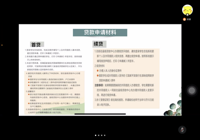会议伊始,郑群老师向同学们讲解了关于助学贷款申请、受理、发放、毕业确认、还款等内容,解答了助学贷款账户与个人缴费银行卡关系等常见学生疑问,开展诚信教育及金融借贷知识宣讲,引导学生主动、按时、履约还款。培训中,针对学生提出的助学贷款相关问题,郑群老师均进行了详细解答,引导学生深入了解并正确认识助学贷款,提高诚信意识和征信意识。