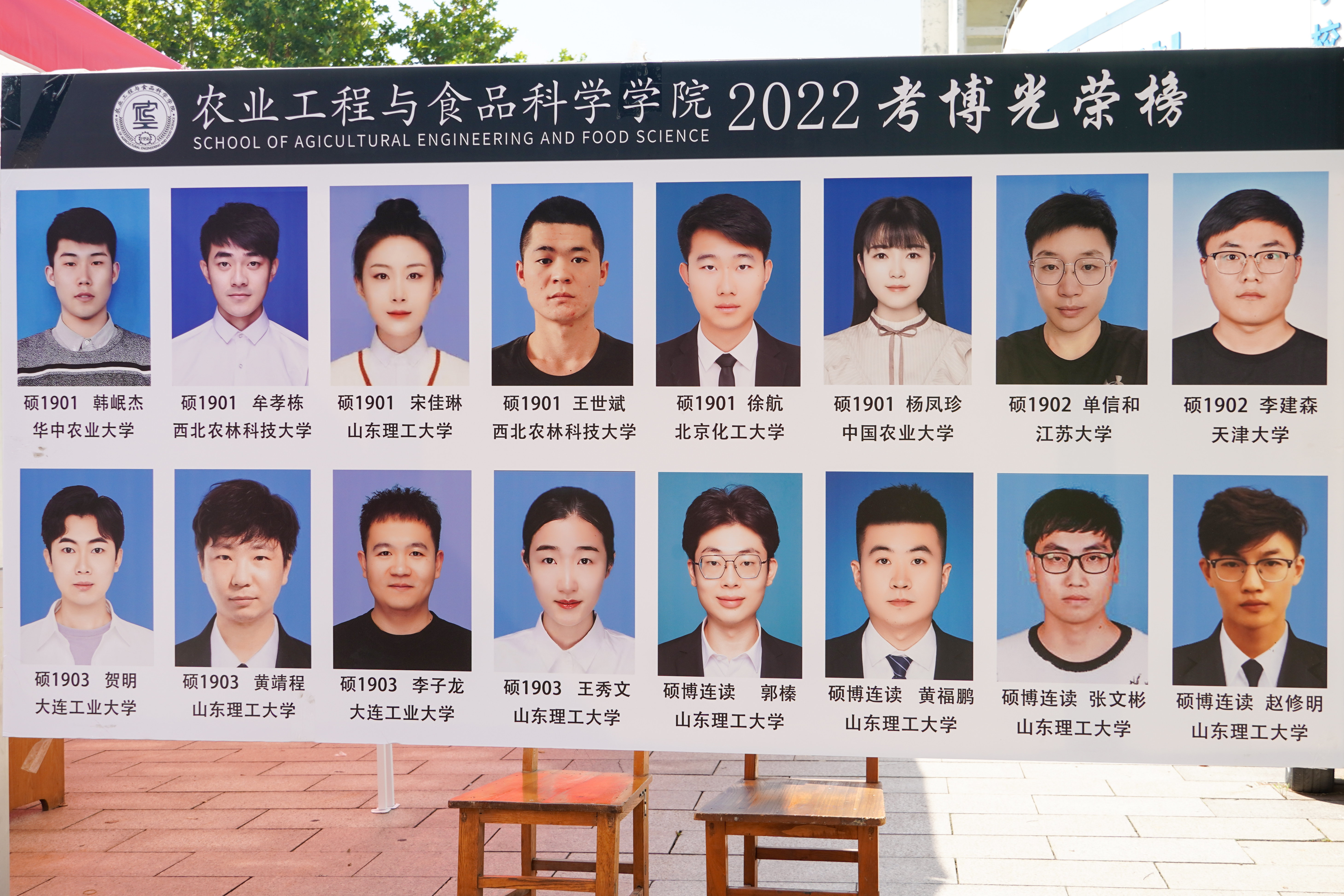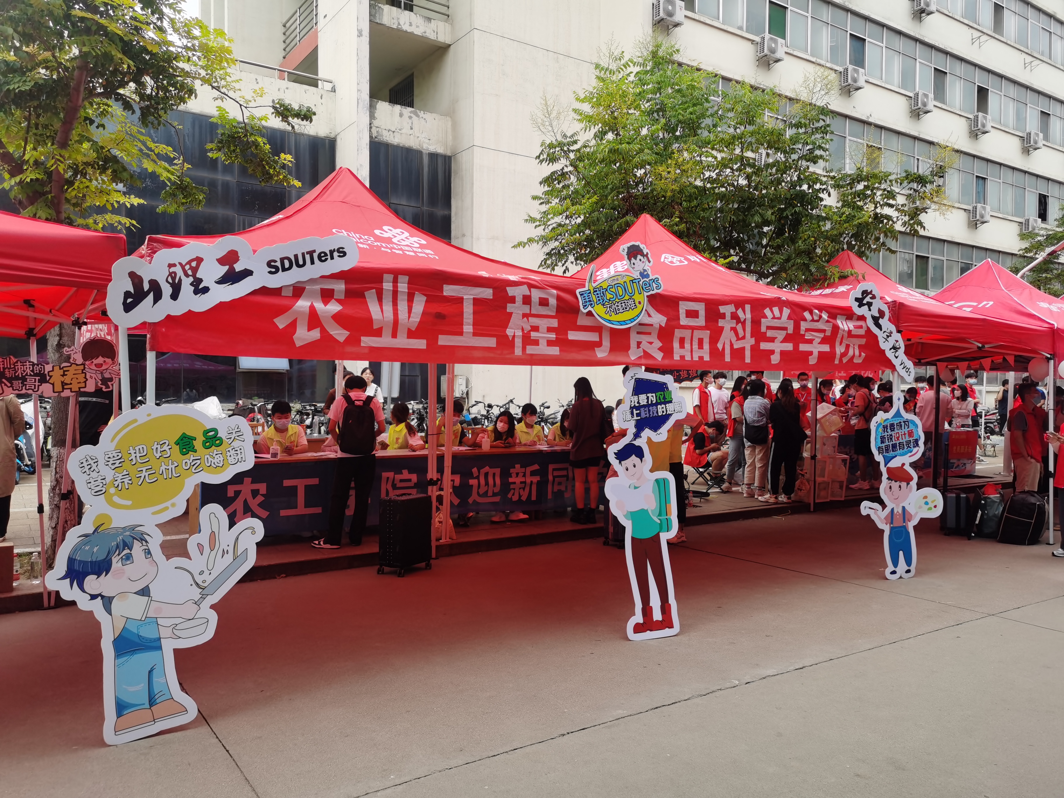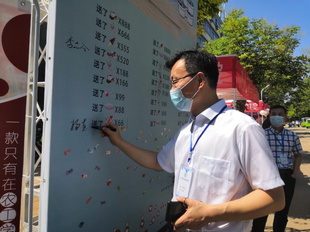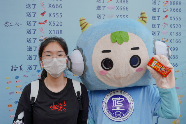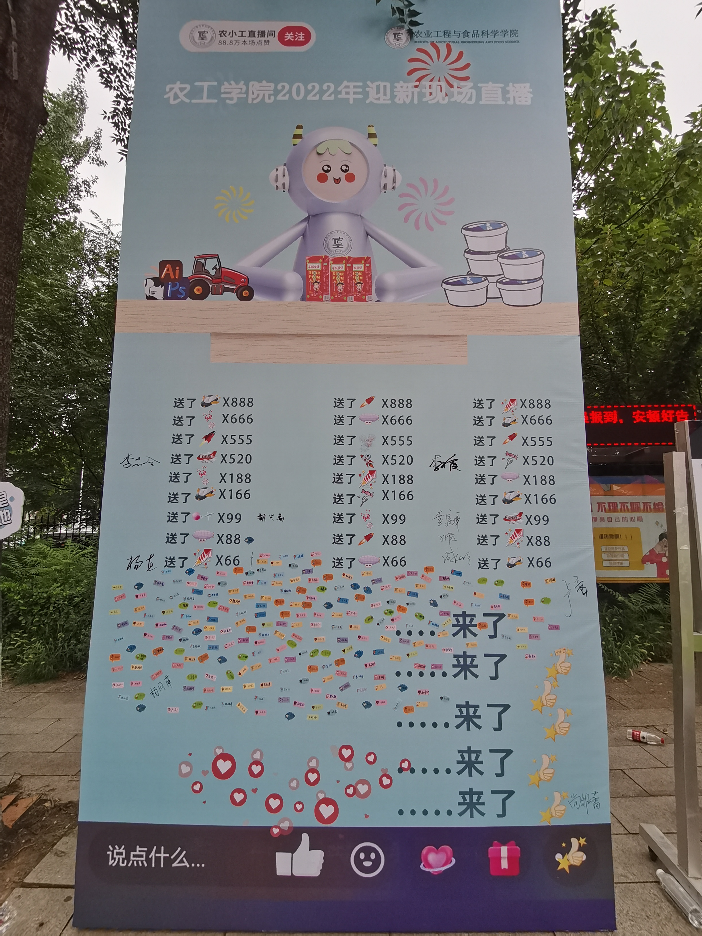 迎新现场,奇思妙想,仪式感满满。新生迎面走来,首先进入眼帘的是考研、考博光荣榜,优秀学长的考研事迹,增强新生对学院及专业的认同感。由食品系赵新河老师制作的科技成果转化产品——酸梅汤,现场分发给新生,为农工新生带来“农”浓关怀。设置虚拟农小工直播间展板,巧妙的将当下最火热的直播和迎新地点布置结合起来,由农小工直播带货展示我院农机、能源、食品、工设专业特色,引起新生们的好奇围观,新生们纷纷张贴姓名贴,打卡“我来了”,并手拿“农工学院yyds”及“网络迎新热词”系列特色标识牌与“农小工”吉祥物、专业特色人形立牌在直播间前拍照留念,感受不一样的开学体验。