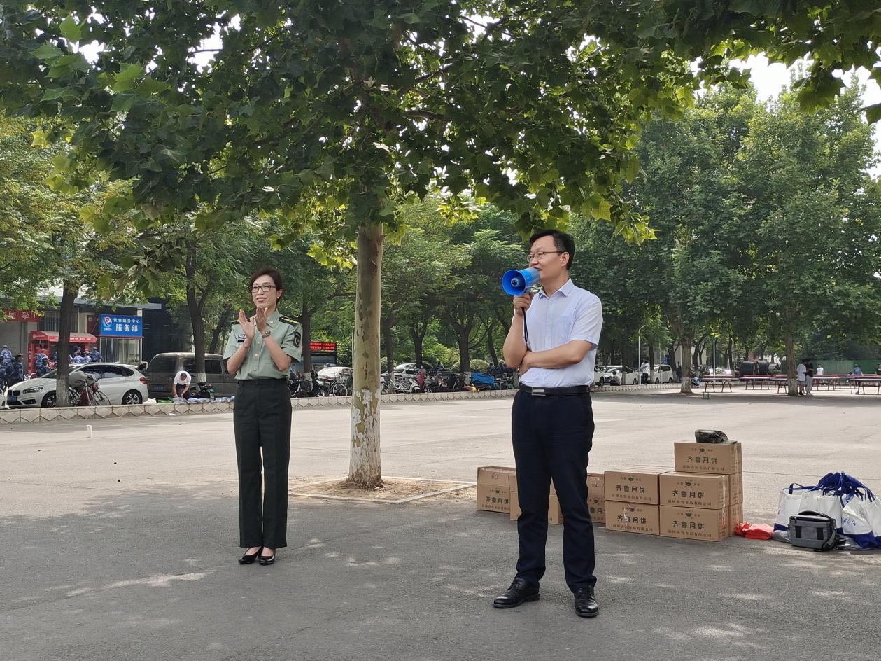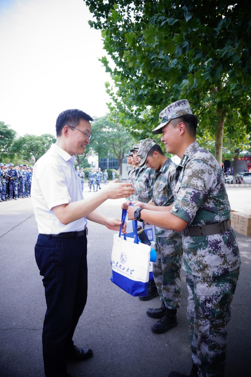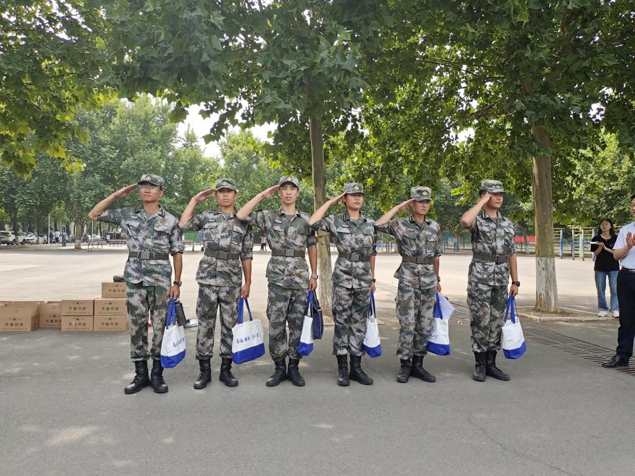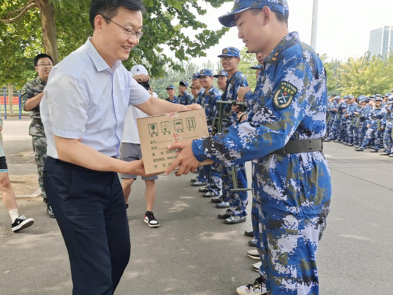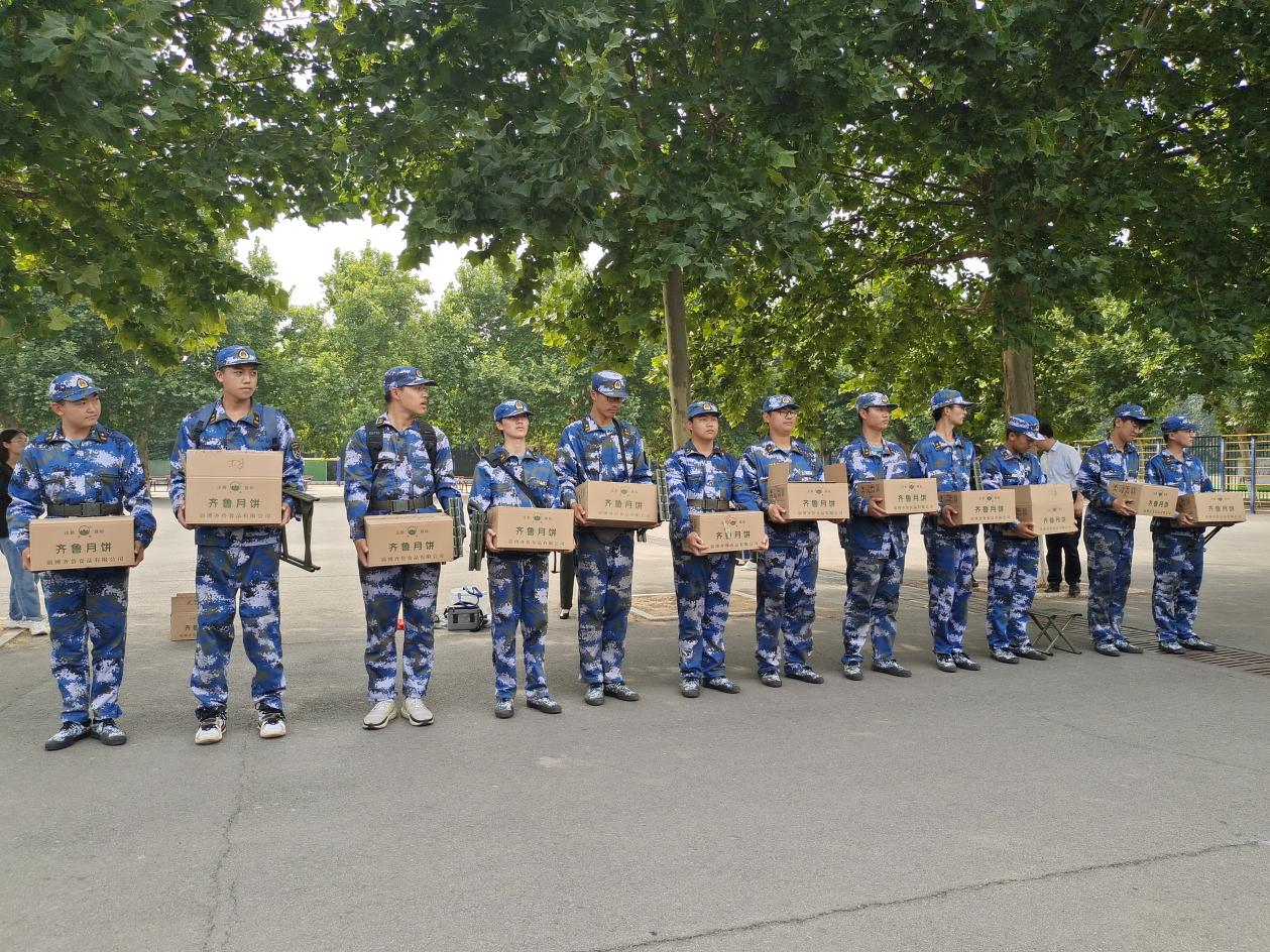 杨直书记在看到参训新生饱满的精神风貌和整齐划一的队伍,给予了充分肯定。他首先关心参训新生的身体素质和环境适应能力,希望同学们发扬不怕吃苦的精神,在加强军事训练的同时,练就健康体魄,锤炼意志品质,为大学生活奠定良好基础。其次,杨直书记向参训的教官和新生送上节日的祝福,祝福同学们学有所成、学有所获,在大学校园中度过一个有意义的中秋佳节。最后,学院领导及新生辅导员为参训教官和新生送上慰问品和月饼,预祝大家中秋节快乐!