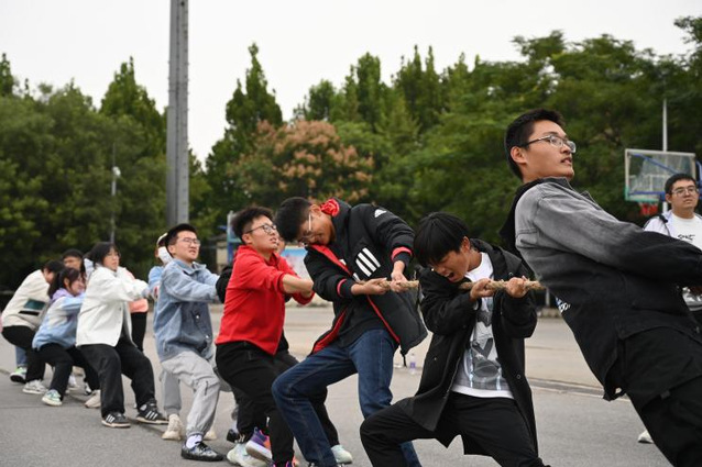 拔河比赛中,随着裁判一声哨响,参赛队员顿时火力全开,齐心协力使劲往后拉,选手们齐喊“一二、一二”。14支参赛队伍轮番上场,一个个重心下移、齐力后拉,为自己的队伍拼尽全力。比赛中男生与女生都不甘示弱,用不服输的气势展现了农工学院学生的精神风貌。
