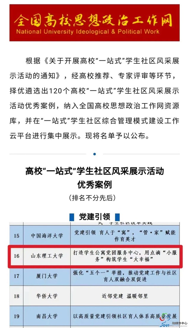 近日,教育部思政司公布高校“一站式”学生社区风采展示活动优秀案例,我校推荐报送的《打造学生公寓党团服务中心,用点滴“小服务”构筑学生“大幸福”》案例成功入选“党建引领”单元优秀案例。
