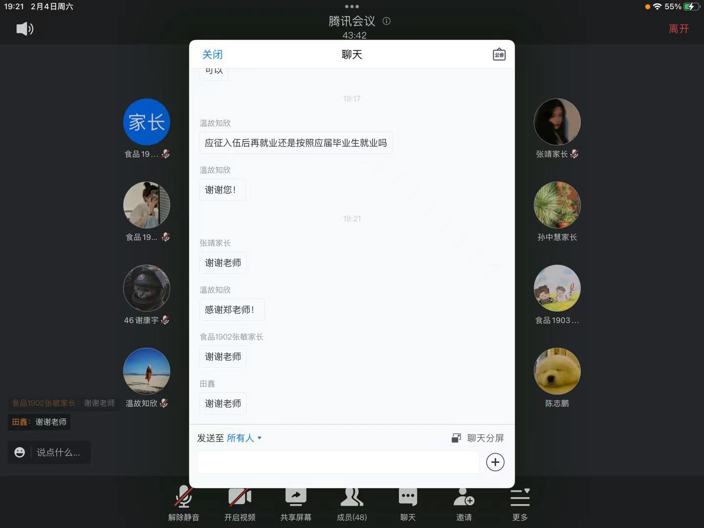 最后,辅导员针对家长和学生提出的就业问题进行详细解答,同时希望家长能够加强与学生的沟通交流,帮助学生摆正就业心态,主动适应就业新形势,树立先就业再择业的就业观,实现更加充分更高质量就业;希望能够充分发挥家校协同作用,家校齐心共助学生成长发展。