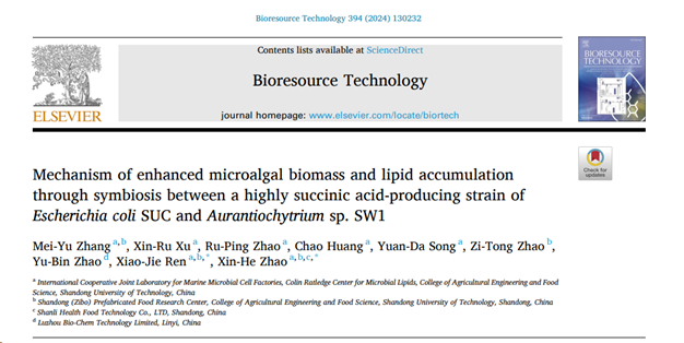 该论文题目为“Mechanism of enhanced microalgal biomass and lipid accumulation through symbiosis between a highly succinic acid-producing strain of Escherichia coli SUC and Aurantiochytrium sp. SW1”。