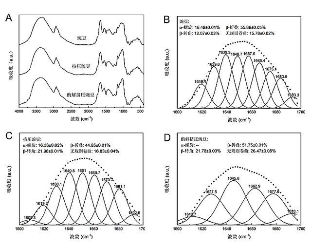 图3 豌豆粉、挤压豌豆和酶解挤压豌豆的傅里叶变换红外光谱图(A)和蛋白质二级结构(B, C, D)
