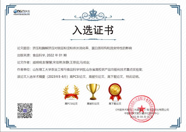我院研究生戚明明(第一作者)、马成业教授(通讯作者)于2022年发表在《食品科学》的论文《挤压和酶解挤压对豌豆粉淀粉体外消化率、蛋白质结构和流变特性的影响》入选中国知网《学术精要数据库》2023年5-6月“高PCSI、高被引、高下载论文”。