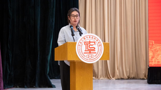 优秀教师代表、食品科学与工程系主任赵新河老师发言。他表示作为一名共产党员教师,不仅会以高标准要求自己做“大先生”,同样会努力帮助学生“练就一身本领”“养成一身正气”。他给新生的学生生涯提出了三点建议:一要勤学不辍,让奋斗成为人生底色;二要行动为先,在实践中上下求索;三要明德修身,用奉献书写不悔青春。