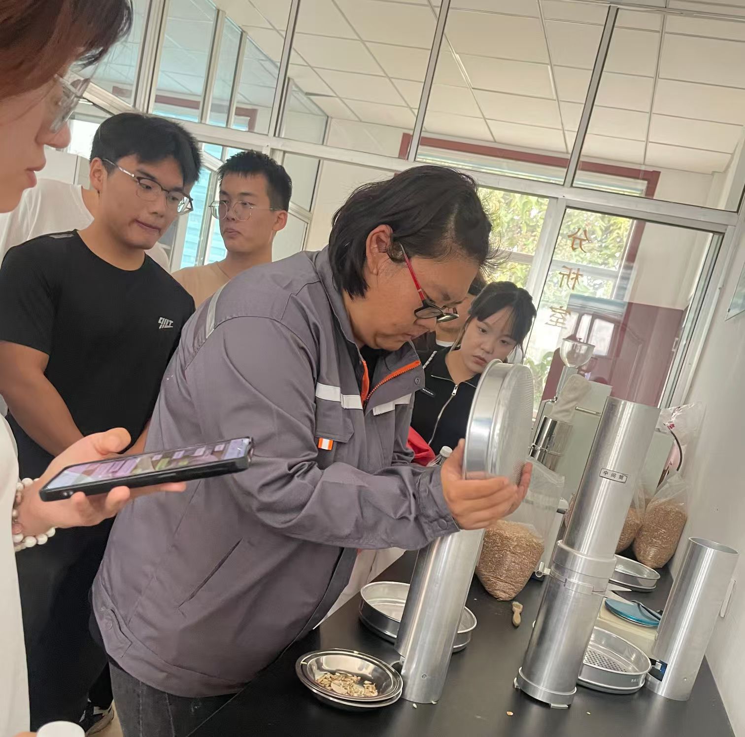 在深加工技术实验室,工作人员向同学们讲解了粮食检测设备仪器的相关知识,分门别类地展示了取样、混样、检测水分、容重和检测脱氧雪腐镰刀菌烯醇等步骤,随后同学们对操作步骤进行了实践体验。整个交流过程热情高涨,工作人员对同学们提出的问题进行了详细解答。