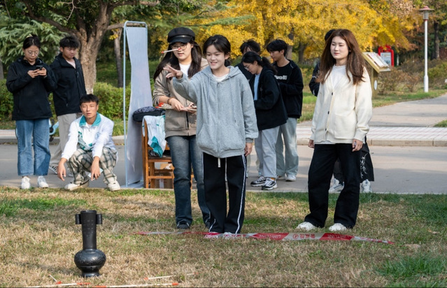 此次校园吉尼斯共25个项目,其中包含墨中夹弹珠、投壶、放飞祝愿等17个单人项目,飞镖大师、长腿连线等4个多人项目以及八人九足、旱地龙舟等4个团体任务。同时本届校园吉尼斯新增挑战“不可能”项目,展现同学们独特的才能。各项目极具趣味性,同学们情绪高昂,积极参与各类游戏项目,现场氛围热烈。 “投壶”项目中,同学们全神贯注,在两米外瞄准壶口轻轻将手中箭矢投出; “放飞祝愿”项目中,同学们满怀期待将 “祝愿”飞向天空; “长腿连线”项目中各成员为了突破每一厘米的距离,不断挑战自己的极限;“八人九足”团队比赛中,同学们发扬团队精神,用彼此的协调配合换来团队的胜利;“旱地龙舟”团队比赛中,各学院代表队协同用力推动龙舟前进,为团队荣誉而战!