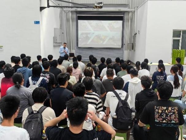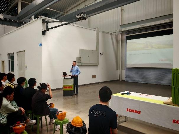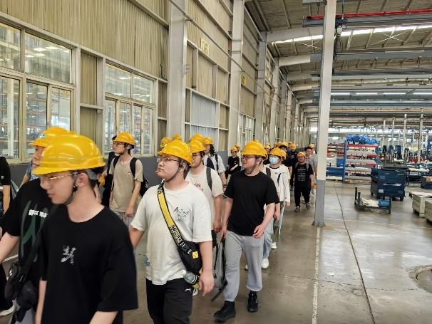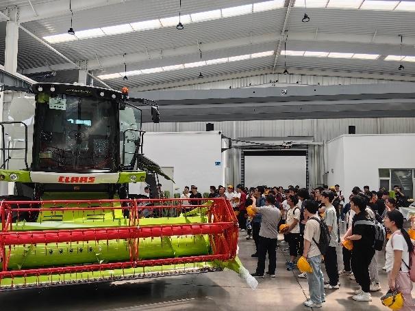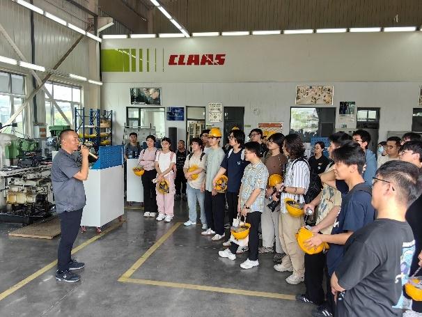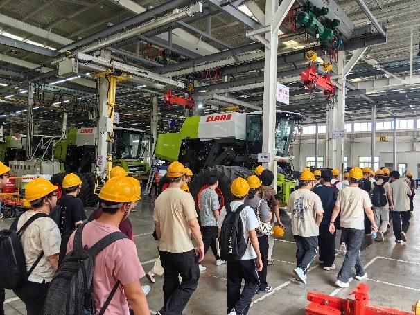 在工作人员的带领下,同学们观摩了科乐收收获机的装配线。从零部件加工到整机组装,近距离学习现代农机的制造流程与质量管理体系。企业工程师现场介绍收获机部件的加工工艺和装配流程,解答同学们的提问。此外,企业工程师向同学们介绍了科乐收的人才培养计划,鼓励学生积极参与科技创新。
